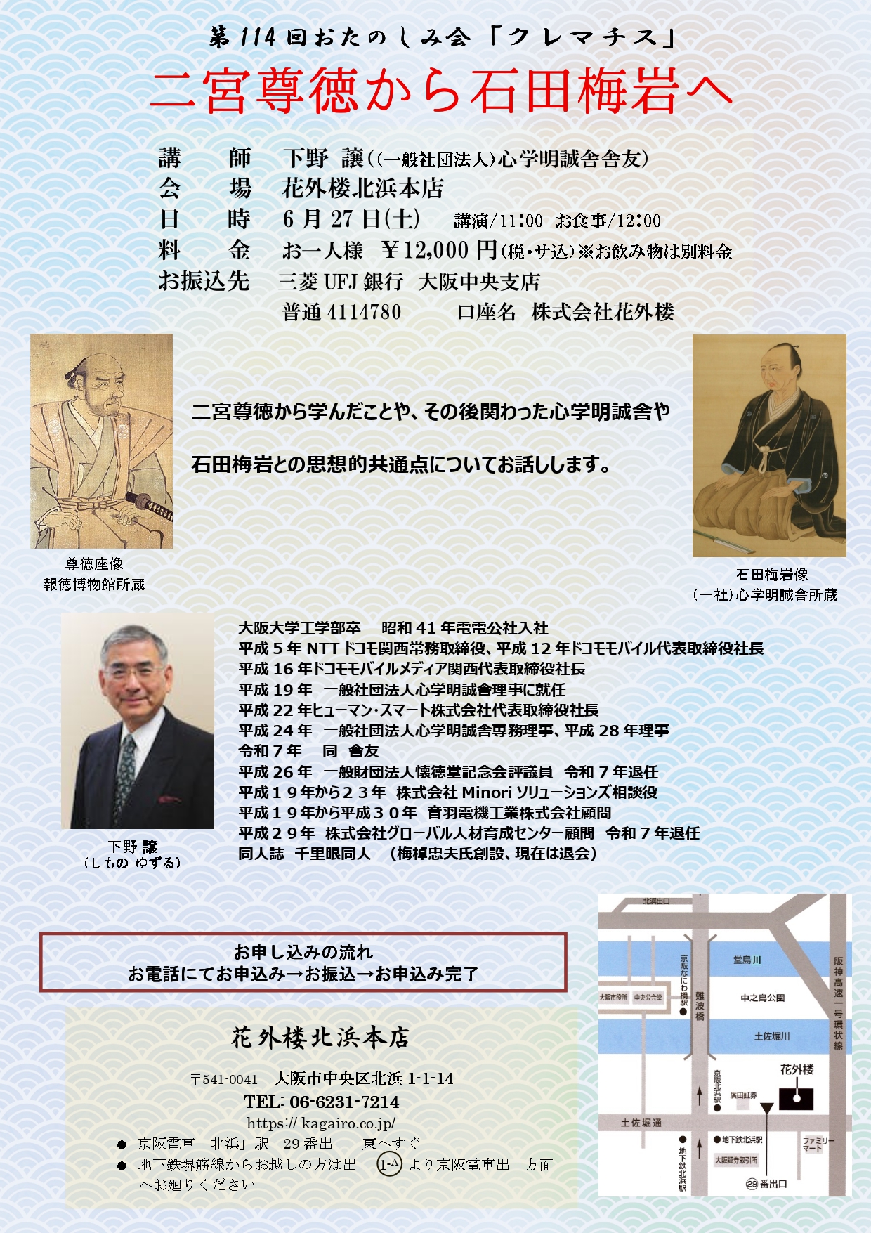 今回は、(一般社団法人)心学明誠舎舎友の下野 讓様に、『二宮尊徳から岩田梅岩へ』というテーマで講演をしていただきます。
