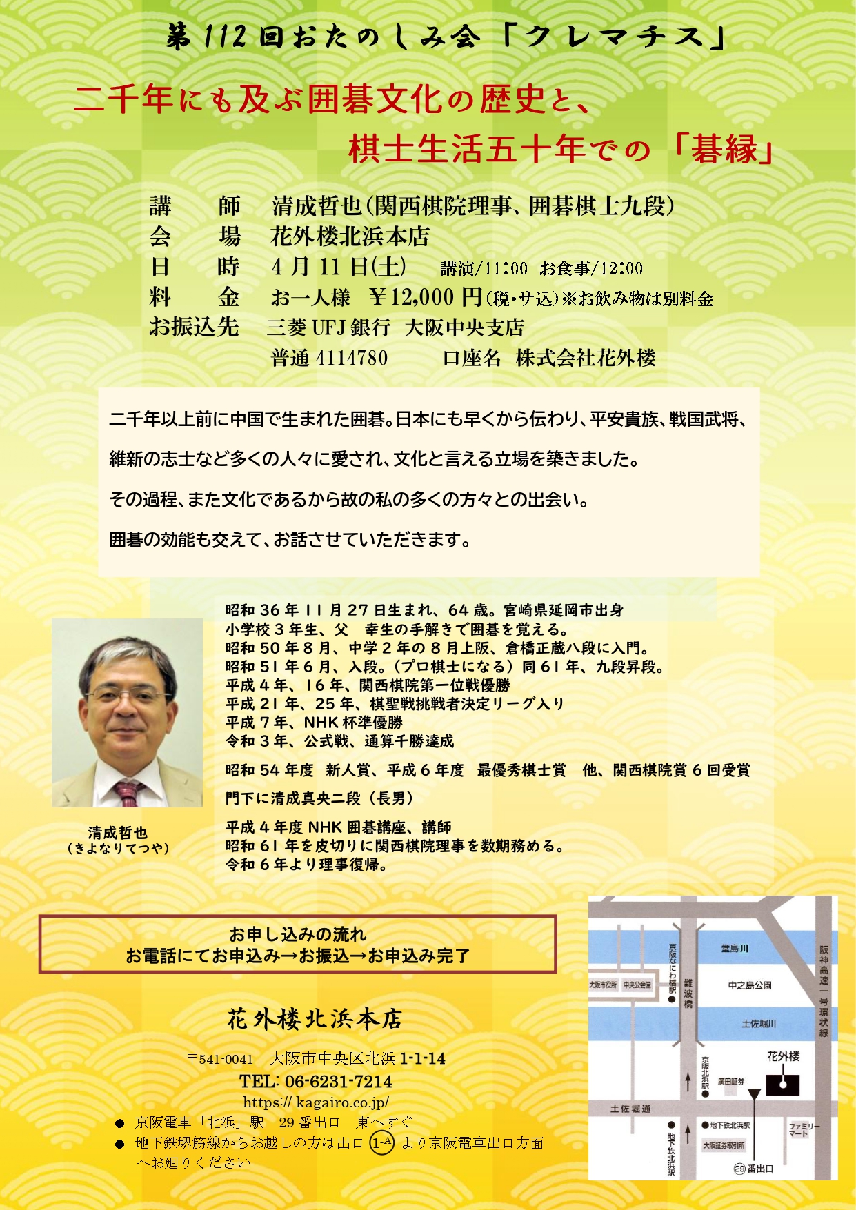 今回は、囲碁棋士九段の清成哲也様に、『二千年にも及ぶ囲碁文化の歴史と、棋士生活五十年での「碁縁」』というテーマで講演をしていただきます。