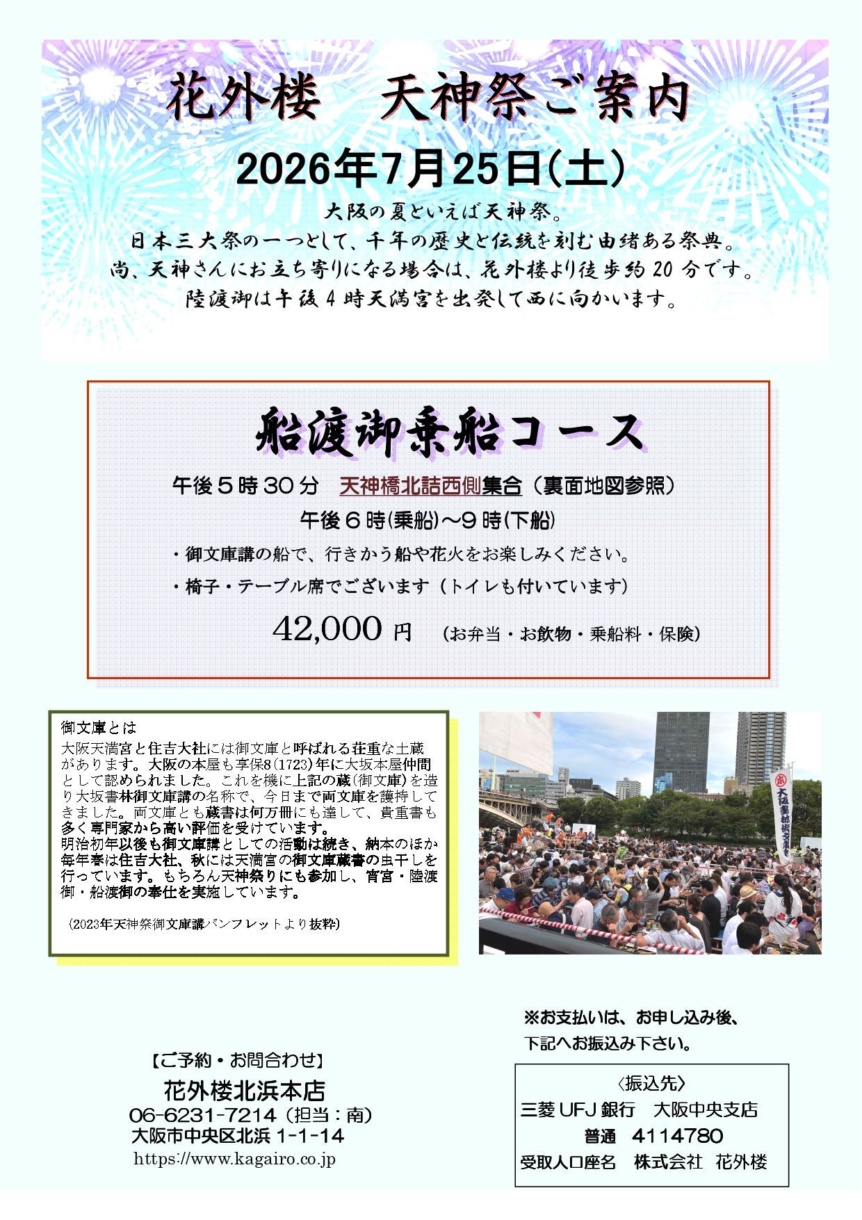 お振込先:三菱UFJ銀行 大阪中央支店 普通4114780 口座名 株式会社花外楼